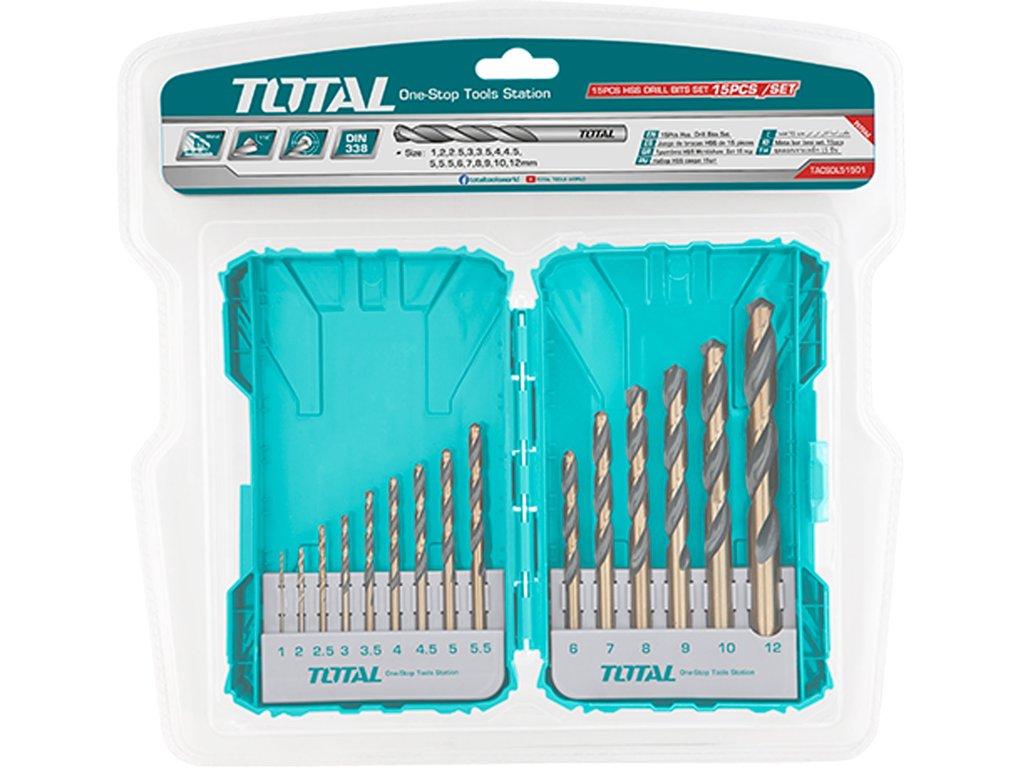 Este conjunto de brocas contém 15 brocas de aço de alta velocidade (HSS) em vários tamanhos. Os tamanhos variam de 1 mm a 12 mm, aumentando em incrementos de 0,5 mm, com exceção dos dois últimos tamanhos que aumentam em incrementos de 1 mm. As brocas são embaladas numa caixa robusta, reforçada com plástico, ideal para armazenamento e transporte.