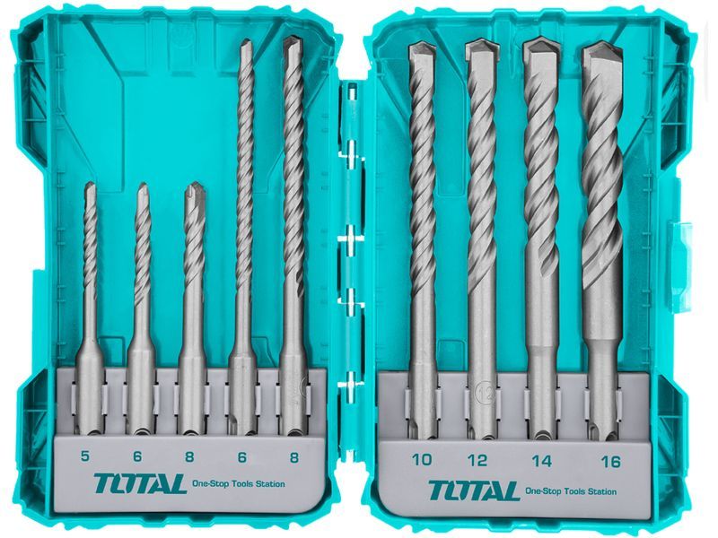 O conjunto contém nove brocas de diferentes tamanhos. Três das brocas têm um comprimento de 110 mm e diâmetros de 5, 6 e 8 mm. As restantes seis brocas têm um comprimento de 160 mm e diâmetros de 8, 10, 12, 14 e 16 mm.