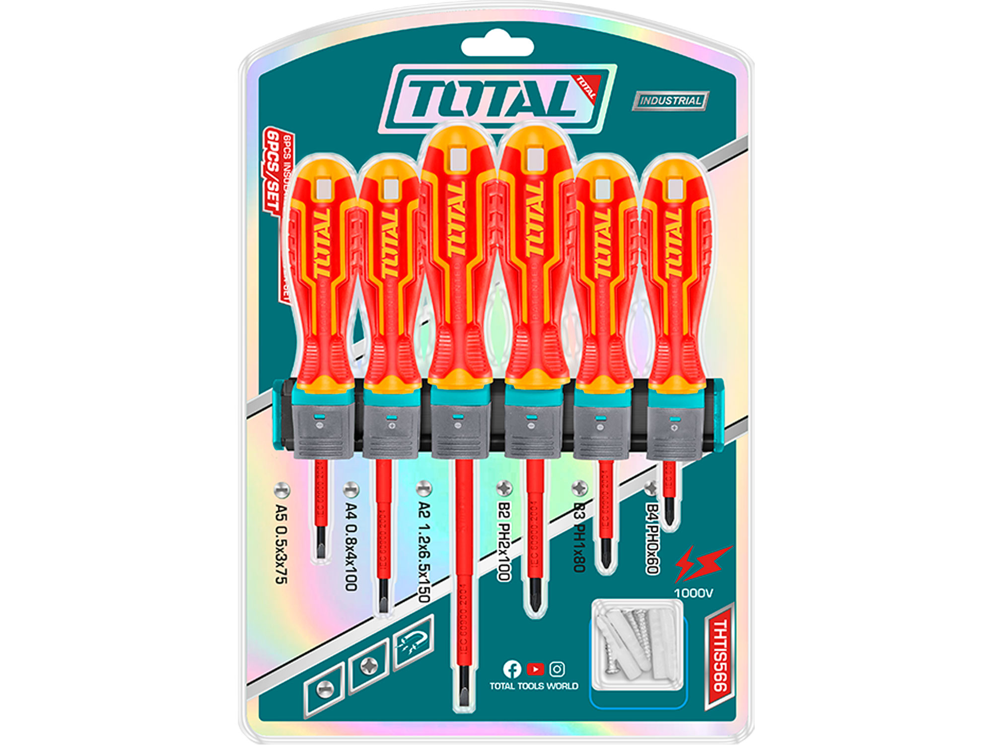 Este conjunto de 6 chaves de fendas foi especialmente concebido para utilização industrial e está em conformidade com as normas VDE para aparelhos eléctricos até 1000 volts. O conjunto contém seis chaves de fendas diferentes, incluindo chaves de fendas com tamanhos (-)3×75, (-)4×100, (-)6,5×150 e chaves de fendas Phillips PH0×60, PH1×80, PH2×100.
