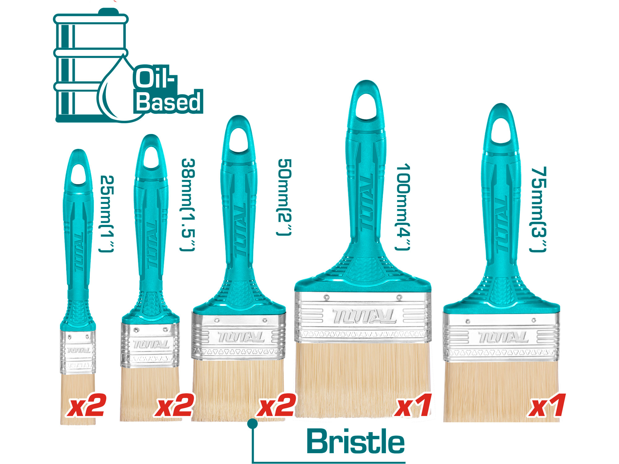 - 2 pincéis com uma largura de 25 mm. Perfeito para pequenos pormenores e áreas de difícil acesso. - 2 pincéis com uma largura de 38 mm. Adequado para áreas de tamanho médio e projectos de pintura geral. - 2 pincéis com uma largura de 50mm. Ideal para áreas maiores e pinceladas largas. - 1 pincel com uma largura de 75mm. Perfeito para aplicações em grandes áreas e para pintar grandes superfícies. - 1 pincel com uma largura de 100 mm. Ideal para áreas muito grandes e superfícies que requerem uma cobertura alargada.Quer seja um pintor profissional ou um entusiasta da bricolage, este conjunto de pincéis oferece-lhe a versatilidade de que necessita para tornar o seu projeto um sucesso.