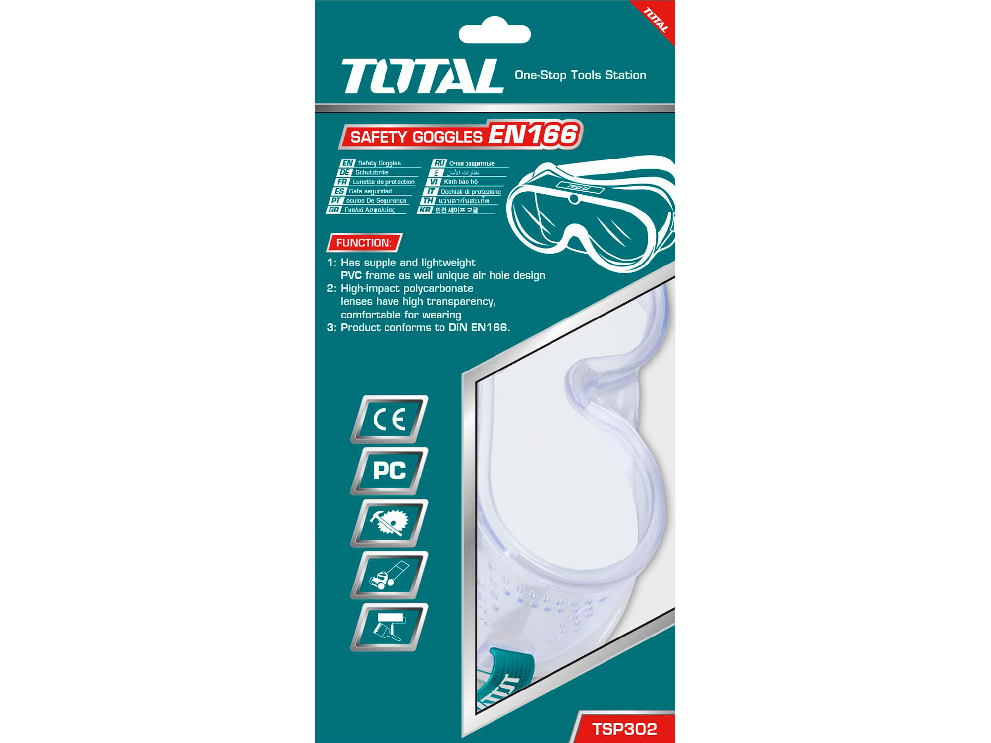 A armação em PVC flexível garante um ajuste confortável e adapta-se perfeitamente a qualquer formato de rosto. As lentes de policarbonato rígido são resistentes a riscos e têm uma elevada resistência ao impacto para proteger os olhos de líquidos, poeiras e influências mecânicas. Oferecem também uma proteção óptima sob forte luz solar graças à proteção UV.