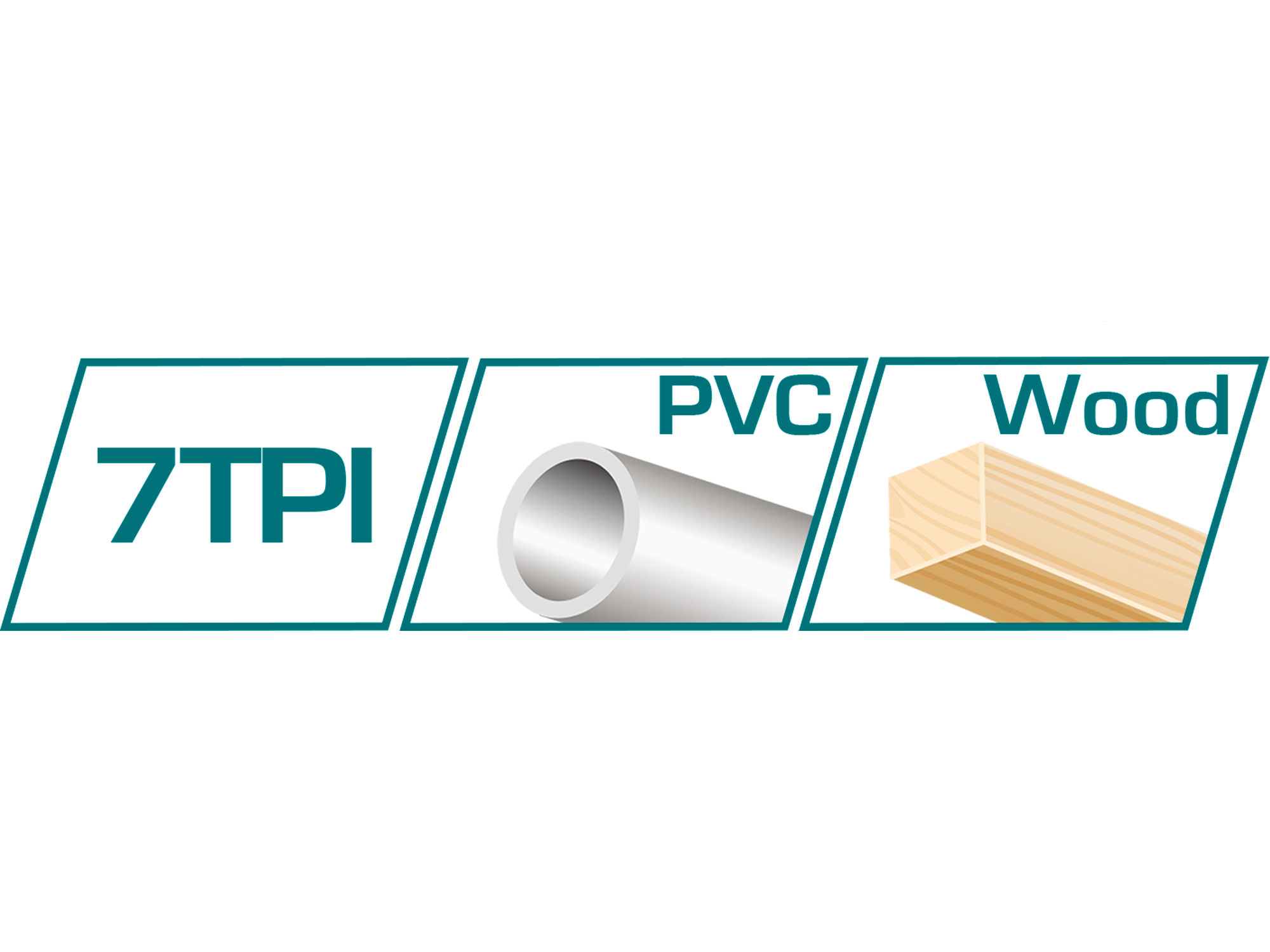 A serra tem 7 dentes por polegada (TPI), o que a torna ideal para cortar vários materiais. Quanto maior o número de TPI, mais fino é o corte que a serra produz.