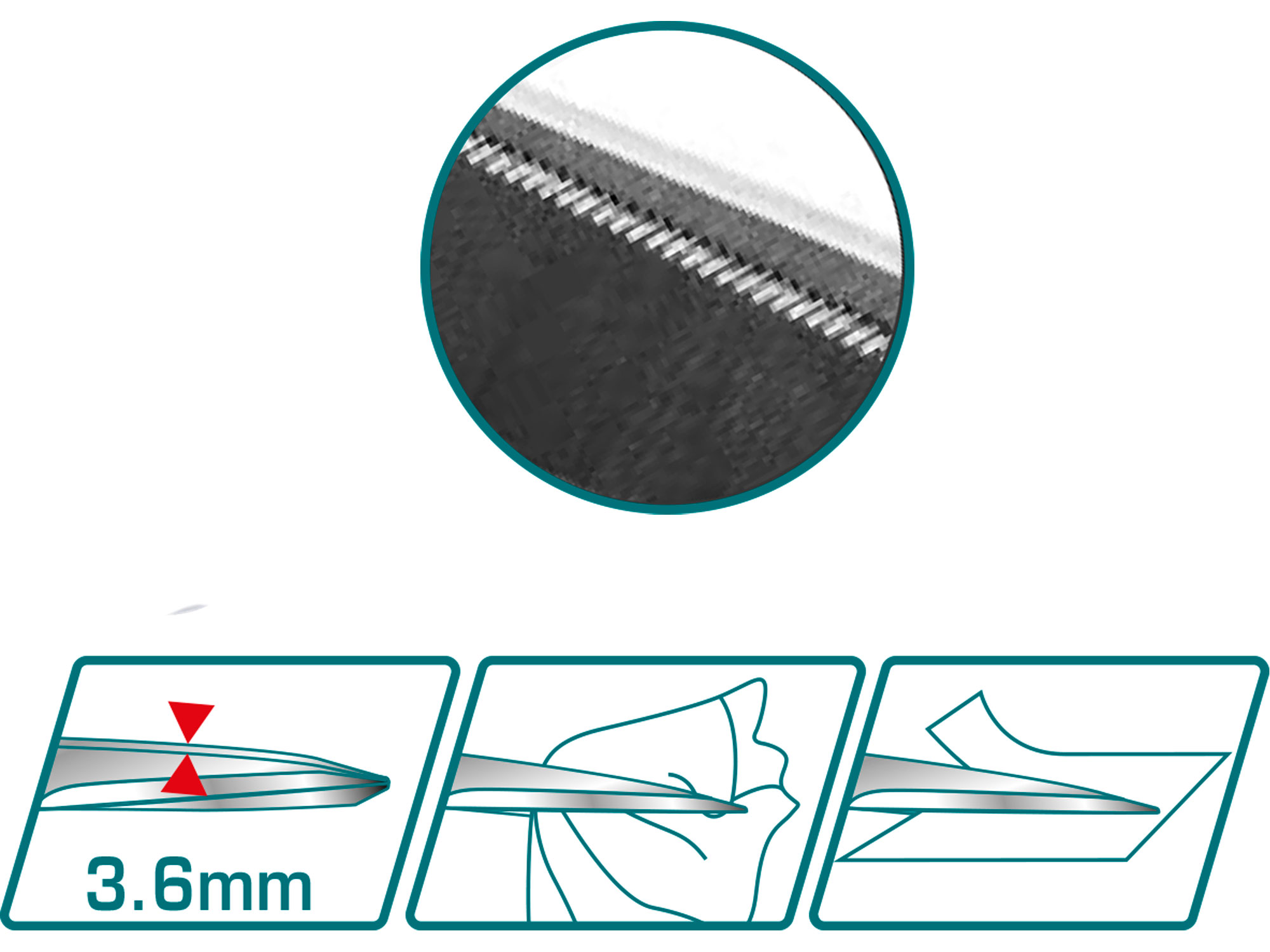 O design exclusivo da mola permite um manuseamento fácil e sem esforço, enquanto o design ergonómico optimiza o cabo e garante um manuseamento confortável e seguro. O cabo é reforçado com aço inoxidável em todo o seu comprimento, tornando a tesoura ainda mais robusta e resistente.
