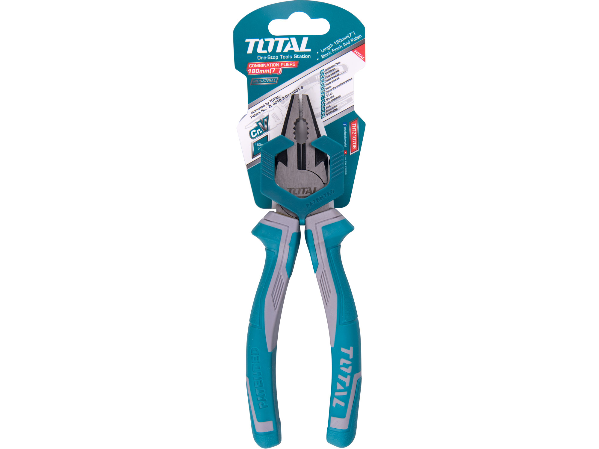 Total O alicate combinado é uma ferramenta indispensável para qualquer comerciante e profissional. Com um comprimento de 180 mm, são compactos e práticos, mas oferecem ainda assim força suficiente para a maioria dos trabalhos.