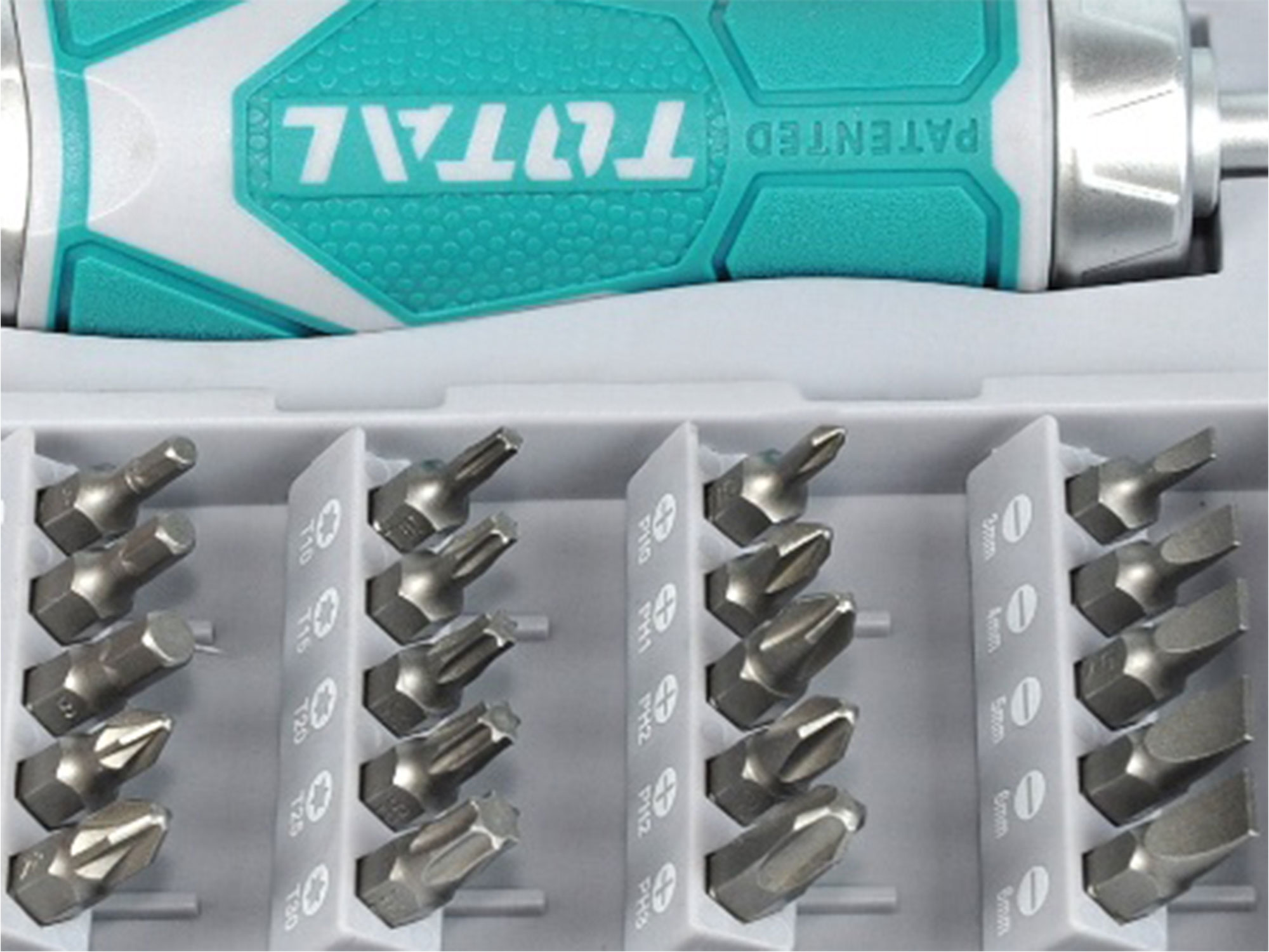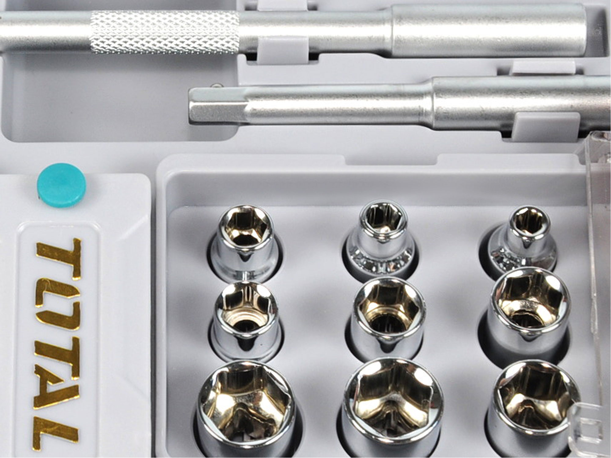 Todas as peças estão cuidadosamente embaladas numa caixa de design TOTAL. Esta caixa é robusta e compacta, pelo que cabe facilmente em qualquer caixa de ferramentas e pode ser levada consigo para onde quer que vá.