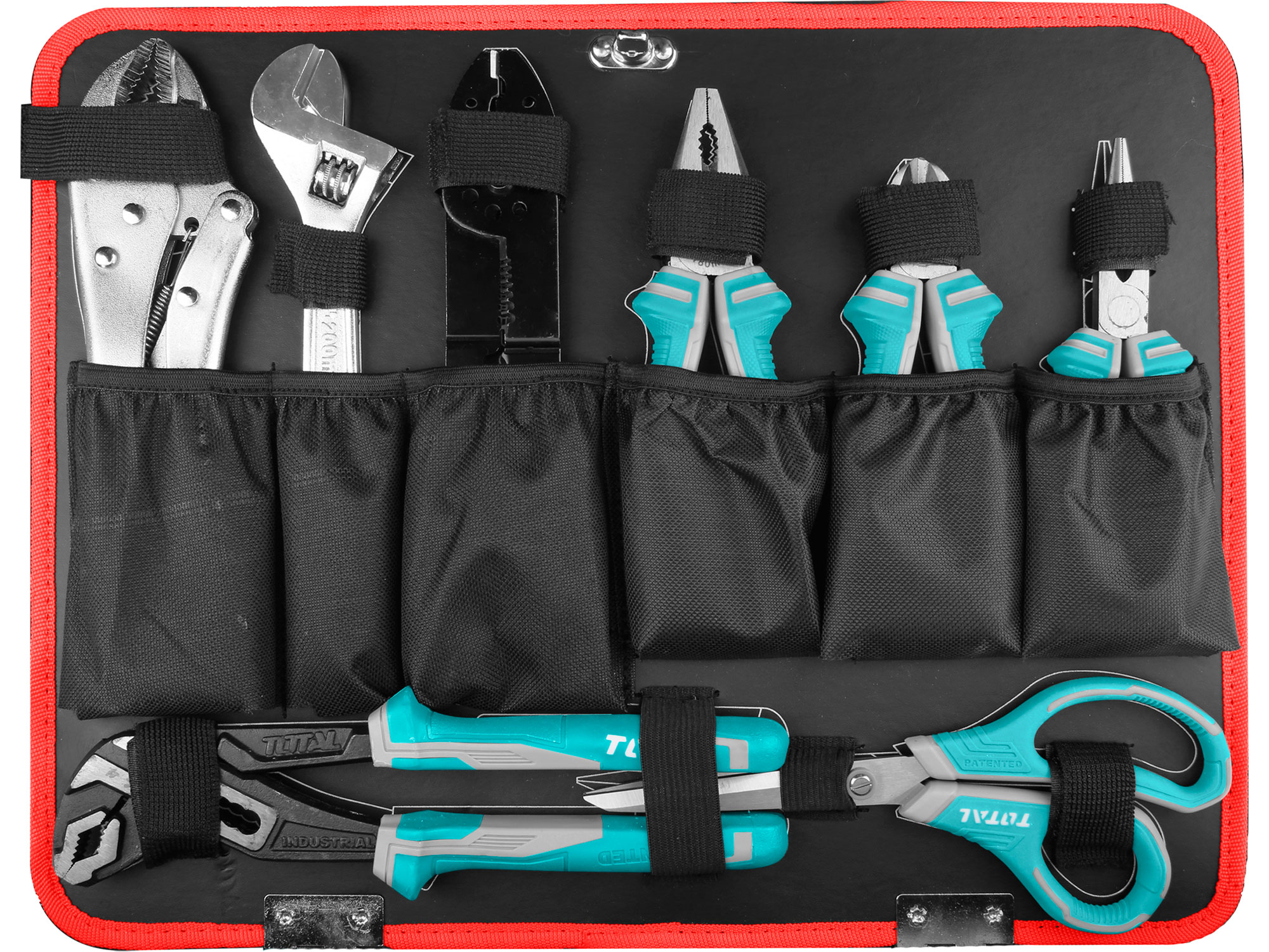 Alicates: 180 mm combinado, 160 mm semi-redondo reto e 160 mm lado cortante, 1 par de alicates SIKO 250 mm, 1 par de alicates de libertação rápida 250 mm, 1 par de descascadores de fios 200 mm