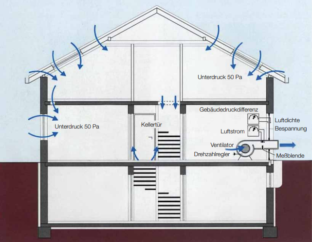Princípio de medição da permeabilidade ao ar. Quando as janelas e as portas estão fechadas, a velocidade do ventilador é aumentada até que uma diferença de pressão do edifício de diferença de pressão do edifício de 50 Pa, por exemplo. O caudal volumétrico a ler é designado por caudal volumétrico de permeabilidade ao ar .