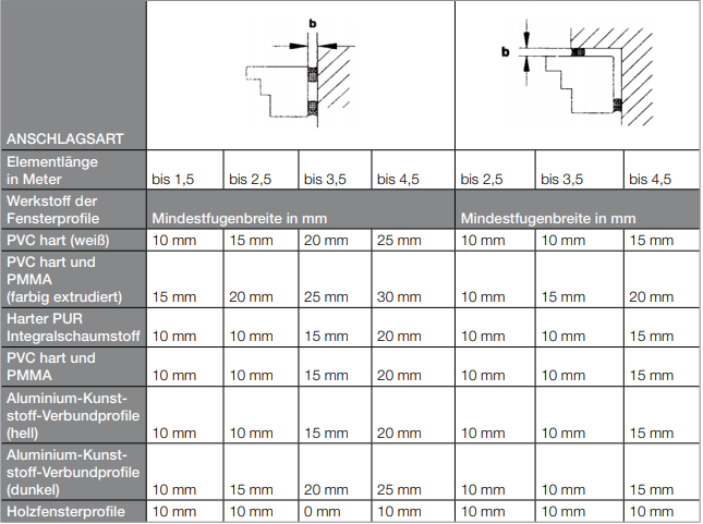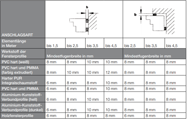 Para que se cometa o menor número possível de erros no dimensionamento das cintas de vedação pré-comprimidas , o ift Rosenheim elaborou a tabela seguinte . A comparação da Tabela 1 com a Tabela 2 mostra rapidamente que a junta pode ser mais estreita com a utilização de cintas de vedação do que com a utilização de vedantes pastosos. Esta é uma clara vantagemeconómica das fitas de vedação.