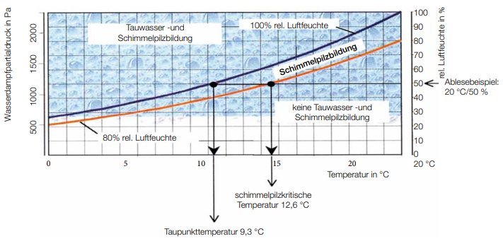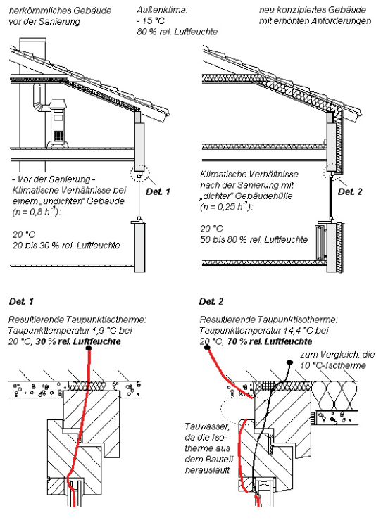 Se, como mencionado no Capítulo 6, a temperatura do componente baixar e o ar ambiente já não conseguir absorver a humidade, ocorrerá condensação. Uma temperatura de 12,6 ºC provou ser crítica neste caso. Utilizando um software especial, as temperaturas de superfície são determinadas numa ligação de edifício e ligadas para formar uma linha, a chamada curva isotérmica.